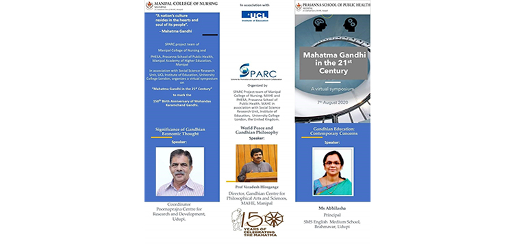 A Virtual Symposium on ‘Mahatma Gandhi in the 21st Century’ was organized on August 7, 2020 through Microsoft Teams by the SPARC Project Team of Manipal College of Nursing, MAHE and PHESA, Prasanna School of Public Health, MAHE in association with Social Science Research Unit, Institute of Education, University College London, the United Kingdom to mark the 150th Birth Anniversary of Mohandas Karamchand Gandhi. The Scheme for Promotion of Academic and Research Collaboration (SPARC) which is a program of the Ministry of Human Resource Development (MHRD), Government of India aims at improving the research ecosystem of India’s Higher Educational Institutions by facilitating academic and research collaborations between Indian Institutions and the best institutions in the world to jointly solve problems of national and/or international relevance. During the Virtual Symposium, Dr. Krishna Kothai (Coordinator, Poornaprajna Centre for Research and Development, Udupi) spoke regarding the Significance of Gandhian Economic Thought. Prof. Varadesh Hiregange (Director, Gandhian Centre for Philosophical Arts and Sciences, MAHE, Manipal) spoke regarding World Peace and Gandhian Philosophy. Ms. Abhilasha (Principal, SMS English Medium School, Brahmavar, Udupi) spoke regarding Gandhian Education: Contemporary Concerns.