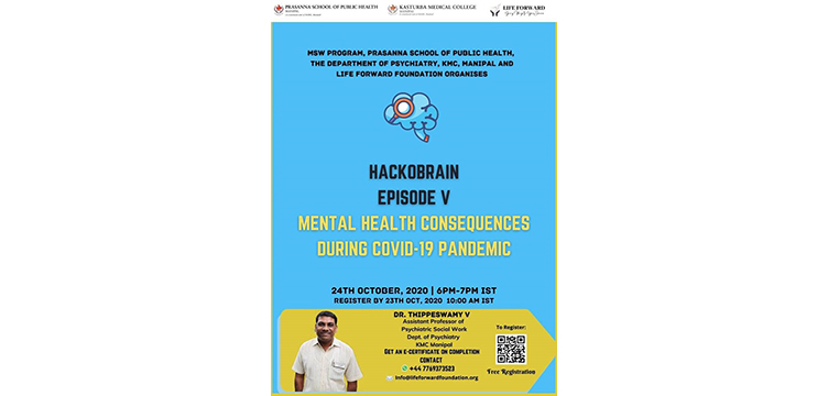 MSW Program - Department of Global Health - Prasanna School of Public Health, The Department of Psychiatry- Kasturba Medical College and Life Forward Foundation are jointly organizing ‘Hackobrain – Episode 5 – Mental Health Consequences during COVID-19 Pandemic’ during 18:00 - 19:00 hours IST of October 24, 2020. Dr. Thippeswamy V (Assistant Professor of Psychiatric Social Work, Department of Psychiatry, KMC, Manipal) is the resource person for the webinar.