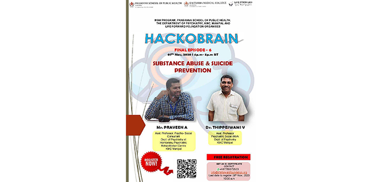 MSW Program, Department of Global Health together with The Department of Psychiatry, Kasturba Medical College (KMC), Manipal and Life Forward Foundation are jointly organizing  ‘Hackobrain – Final Episode 6 – Substance Abuse and Suicide Prevention’ on November 7, 2020 (16:00 - 17:00 hours IST). Mr Praveen A (Assistant Professor, Psycho-Social Consultant, Department of Psychiatry at Hombelaku Psychiatric Rehabilitation Centre, KMC) and Dr Thippeswami V (Assistant Professor, Department of Psychiatry, KMC) will be the resource persons for this webinar.