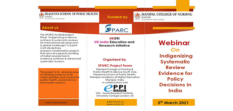 The SPARC Project Team (Manipal College of Nursing and Public Health Evidence South Asia, Prasanna School of Public Health) in collaboration with UCL Social Research Institute, University College London, UK is organizing a webinar on ‘Indigenizing Systematic Review Evidence for Policy Decisions in India’ on March 05, 2021 (14:30 to 16:30 hours IST) through Microsoft Teams.