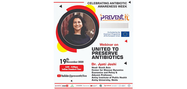Prasanna School of Public Health cordially invites you to the webinar (an initiative co-funded by the Erasmus+ Programme of the European Union) on the theme "United to Preserve Antibiotics" on November 19, 2020 (15:00-16:00 IST via Zoom Meetings) as part of World Antimicrobial Awareness Week 2020.