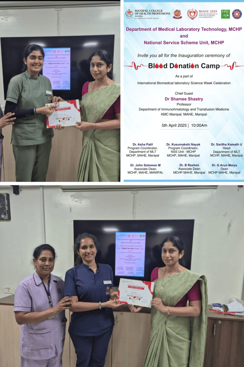 As a part of International Biomedical Laboratory Science Week celebration, Department of Medical Laboratory Technology, Manipal College of Health Professions, Manipal and National Service Scheme Unit, Manipal College of Health Professions, Manipal, in association with Department of Immunohematology and Transfusion Medicine, KMC, Manipal organized a Blood Donation Camp on 5th April 2025.
