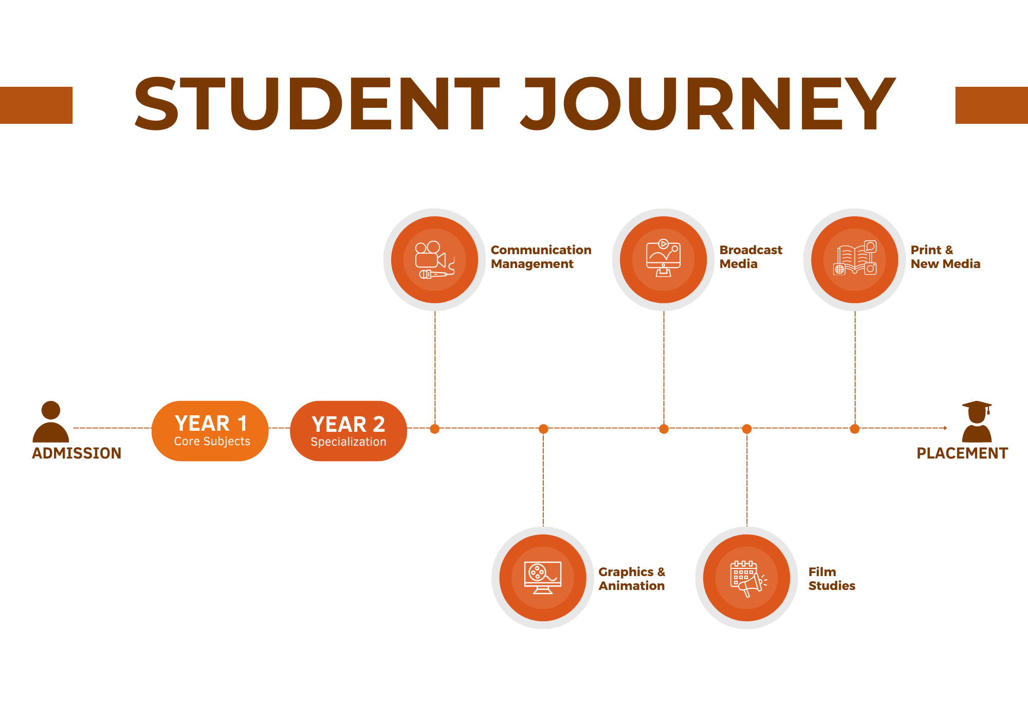 The program focuses on industry-relevant subjects such as Digital Marketing, Corporate Communication, Advertising, Public Relations, Event Management, Media Analytics and AI, Radio & Podcast Production, TV Production, Digital News, Print Journalism, Entertainment Content Production, and Media Research.