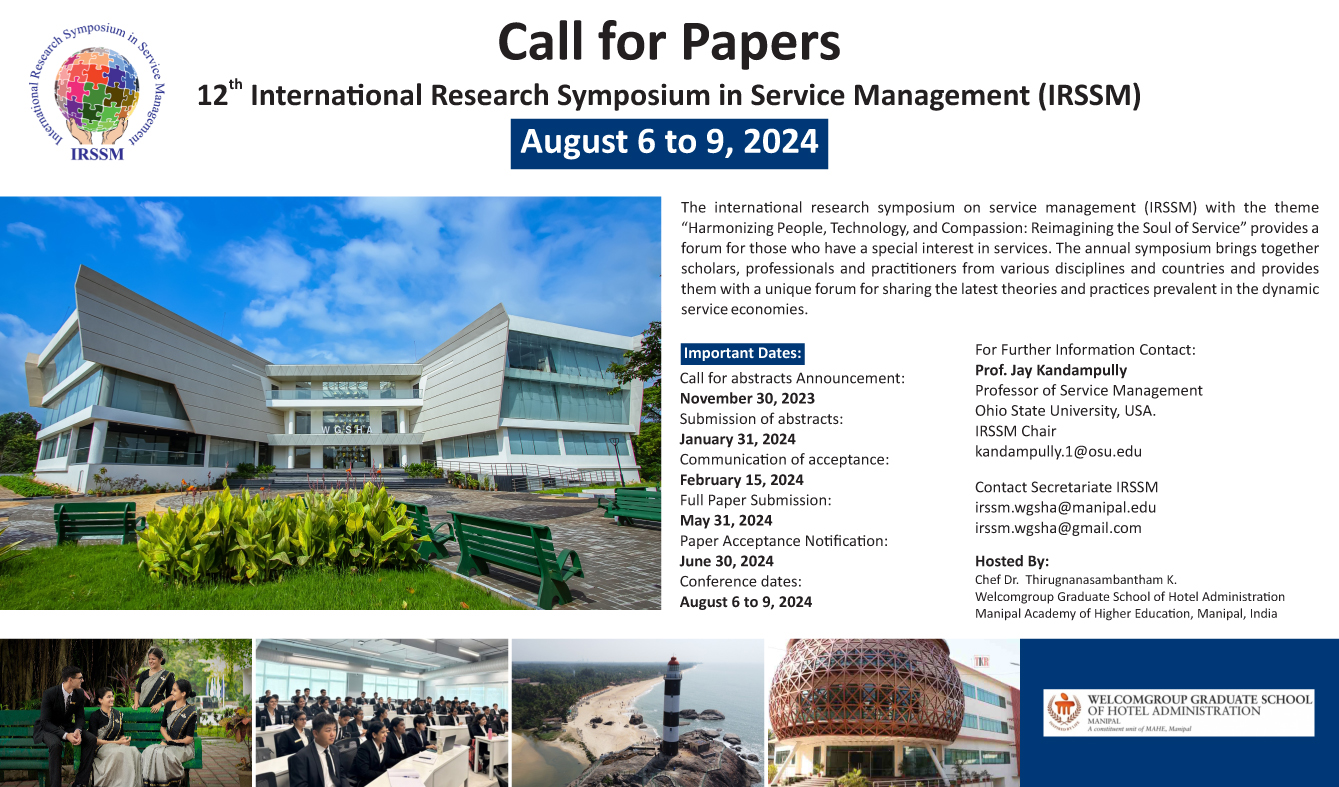 We are delighted to announce the upcoming 12th International Research Symposium in Service Management, scheduled to take place from August 6th to 9th, 2024, at the Welcomgroup Graduate School of Hotel Administration, Manipal Academy of Higher Education, Manipal.
