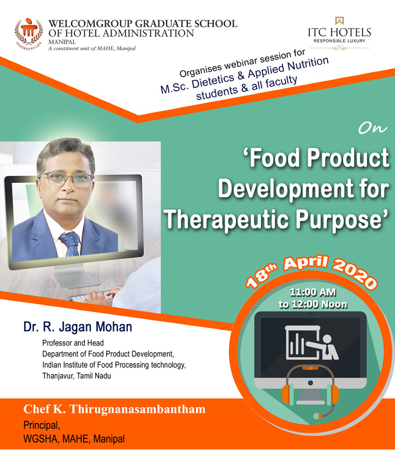 A webinar is organized on Food Product Development for Therapeutic Purpose by Dr. R. Jagan Mohan - Professor and Head, Department of Food Product Development, Indian Institute of Food Processing Technology, Thanjavur, Tamil Nadu