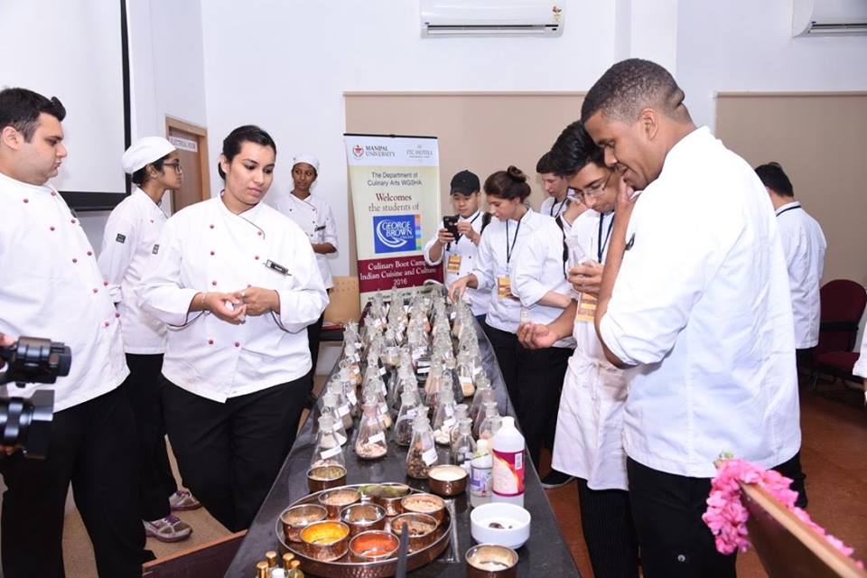 Culinary Boot Camp with the participation of a foreign university, the first of its kind in India began at the Department of Culinary Arts here on Monday. And a dozen students from George Brown College, Canada are here at Welcomgroup Graduate School of Hotel Administration, Manipal Academy of Higher Education to study Indian cuisine which is steeped in cultural diversity. Completing the baker’s dozen is the faculty who has accompanied the students. On Monday, the first day of the Boot Camp, the students after being addressed by the WGSHA Principal, Mrs Parvadhavardini Gopalakrishnan and the vice principal, Chef K. Thiru were initiated into the aroma of the spices that give Indian cuisine the flavour. The students were all too excited to experience how the aromas blend to lend taste to the dishes. The final year students of BA Culinary Arts were the ones who took the Canadians through the use of spices in the different cultures in the country. They also explained the religious and foreign influences on Indian food. The Canadian students had an interactive, hands-on cooking class with Chef Manoj on Rajasthani Cuisine. A mouth-watering menu of Rajasthani classics like Dal, Baati, Churma, RajasthaniGattaKadhi and LalMaans was prepared. The Roomali Roti session was fun. The students tried their hands at shaping dough into wafer thin bread by twirling on the backs of their hands and then cooking it overa griddle turned upside down over fire. It was a very fascinating session for the visitors. The students are: Christianna Bentley; Joanne Brathwaite; Harvir Butter; Christopher Jurians; Samuel Lorinc; Joey Ma; Chun Fai Mak; MalateePramanus; Sarah Robinson; Dominique Spanovic; Ajani Taylor; Wei Wei Zhu.Charlton Alvares (Faculty).