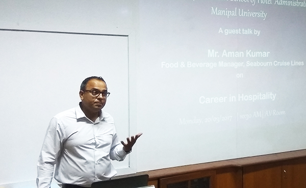 Career in Hospitality: Guest talk by Mr Aman Kumar A guest talk on “Career in Hospitality” was organized for the students of 31st Course BHM. The talk was delivered by Mr. Aman Kumar Food & Beverage Manager, Seabourn Cruise Lines on 20 March 2017 at WGSHA, Manipal. The speaker gave a brief introduction of the cruise industry and then touched upon the growth, future potential and challenges pertaining to the industry. This was followed by a Question & Answer session where Mr Kumar answered queries on: >> Career opportunities in the cruise industry – job positions, salary and other benefits offered, career track, professional growth and job satisfaction. >> The difference between a career in hospitality on land and in hotels and on water and in cruise lines- challenges and opportunities. >> Problems facing the growth and expansion of cruise industry in India. >> Importance of hygiene for food handlers and ways and means to prevent outbreak of foodborne illness on ships.