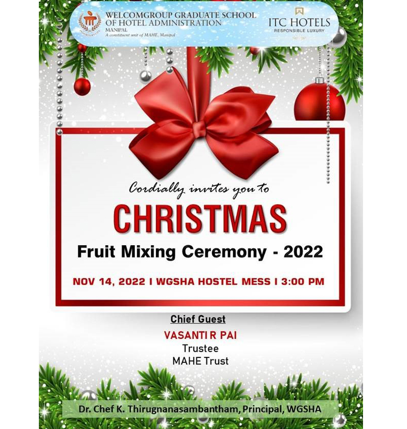 WGSHA Manipal November 14, 2022: WGSHA is holding a "Fruit Mixing Ceremony" today November 14, 2022 at its hostel mess area to welcome this Christmas season a tradition that is observed worldwide!
