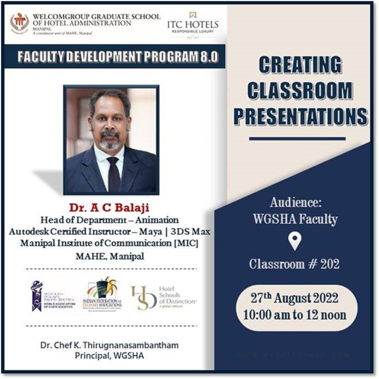 We are proud to present the resource person of FDP 8.0 -A C Balaji Assistant Professor - Selection Grade & HOD – Animation, Manipal Institute of Communication, MAHE, Manipal. Dr. Balaji is an expert in Computer Graphics | Animation | Design | UX/UI | Interface Design | Motion Design | Web Design | and Graphic Design. His research interests include Character Design | Character Branding | Merchandising | Character Licensing | and Television Cartoon Shows.