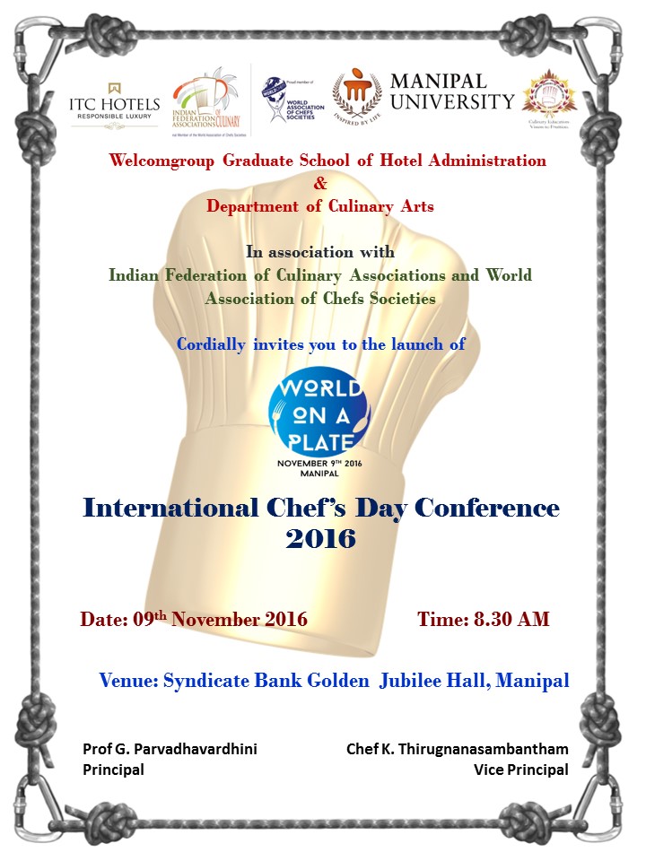 Welcomgroup Graduate School of Hotel Administration & Department of Culinary Arts in association with Indian Federation of Culinary Associations and World Association of Chefs Societies Cordially invites you to the launch of "International Chef’s Day Conference 2016"