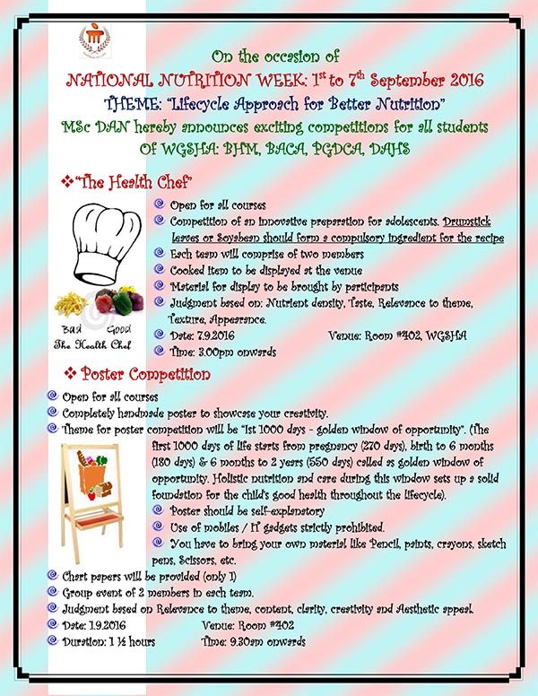 On the occasion of NATIONAL NUTRITION WEEK: 1st to 7th September 2016 THEME: “Lifecycle Approach for Better Nutrition” M.Sc. DAN hereby announces exciting competitions for all students Of WGSHA: BHM, BACA, PGDCA, DAHS For more click here