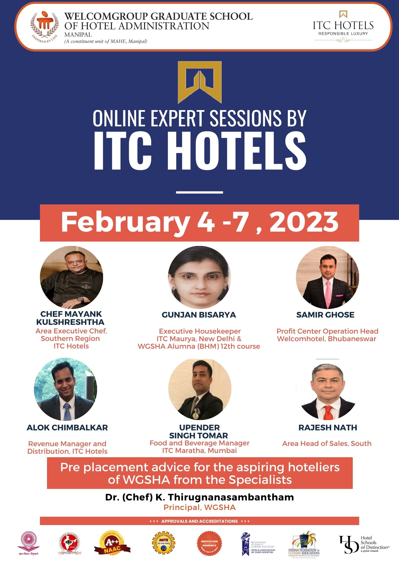 WGSHA announces the commencement of the on-line expert sessions of the year by top management of ITC Hotels from 4th -7th February 2023 on various operational departments. The sessions will familiarize the graduating batch of students regarding the company ethos as well the qualities the hoteliers look for amongst the new recruits for their respective department. It will help the students gather the latest trends in the industry and help them to be confident while appearing in interviews.