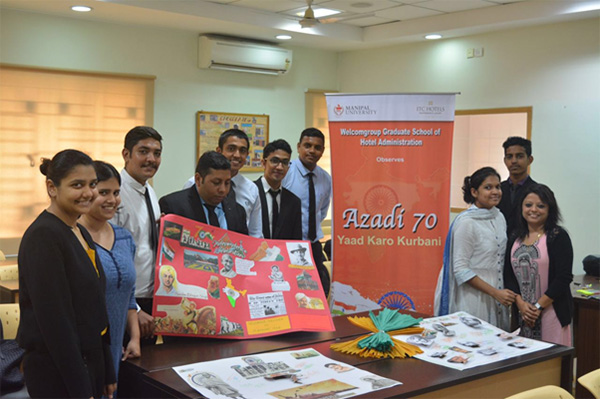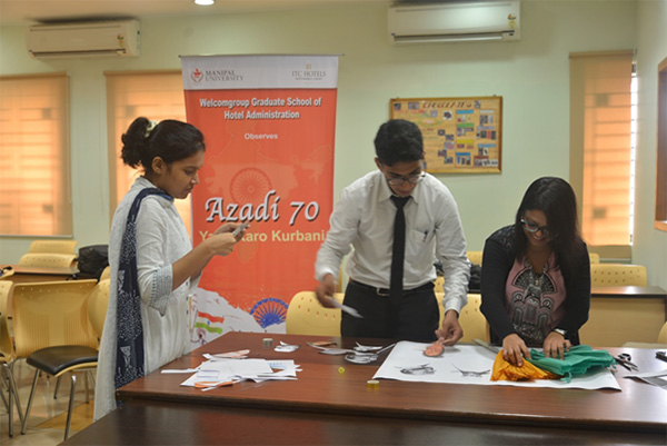 The most historic and celebrated day in the history of India, is that of its Independence. This day marks the birth of a free nation. It was on this very day’s eve that the Indian flag was proudly unfold by Jawaharlal Nehru, the first prime minister of India at the Red Fort in Delhi. WGSHA – Welcomgroup Graduate School of Hotel Administration took the opportunity to celebrate this day and the spirit of oneness by organizing an interactive competition to observe the sacrifice and bravery of our freedom fighters. The batch of 2016-17 of Post Graduate Diploma in Culinary Arts contributed to the event by undertaking a Collage Making Competition. The class was divided into teams of 3 and all the teams started preparing the collages will full zeal and enthusiasm. These collages depicted the courage and fearlessness of our freedom fighters. As our one hour was about to finish, we witnessed the competitive spirit and the giggles in the room. Colourful chart papers, pictures of our freedom fighters and the colours of our national flag; everything added to the mood. It was our salute to the true heroes and to the proud feeling of being Indian!