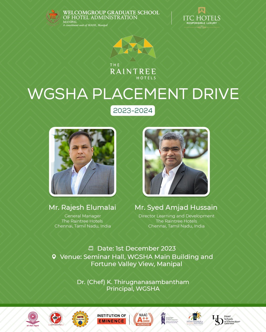 The Raintree Hotels is cordially invited to participate in the Welcomgroup Graduate School of Hotel Administration's (WGSHA) forthcoming Placement Drive 2023-24. The presence of those in attendance at this instant signifies the inception of an enthralling expedition for our student body. Our students will benefit significantly from The Rain Tree Hotels' participation in this recruitment initiative as they embark on their professional careers.