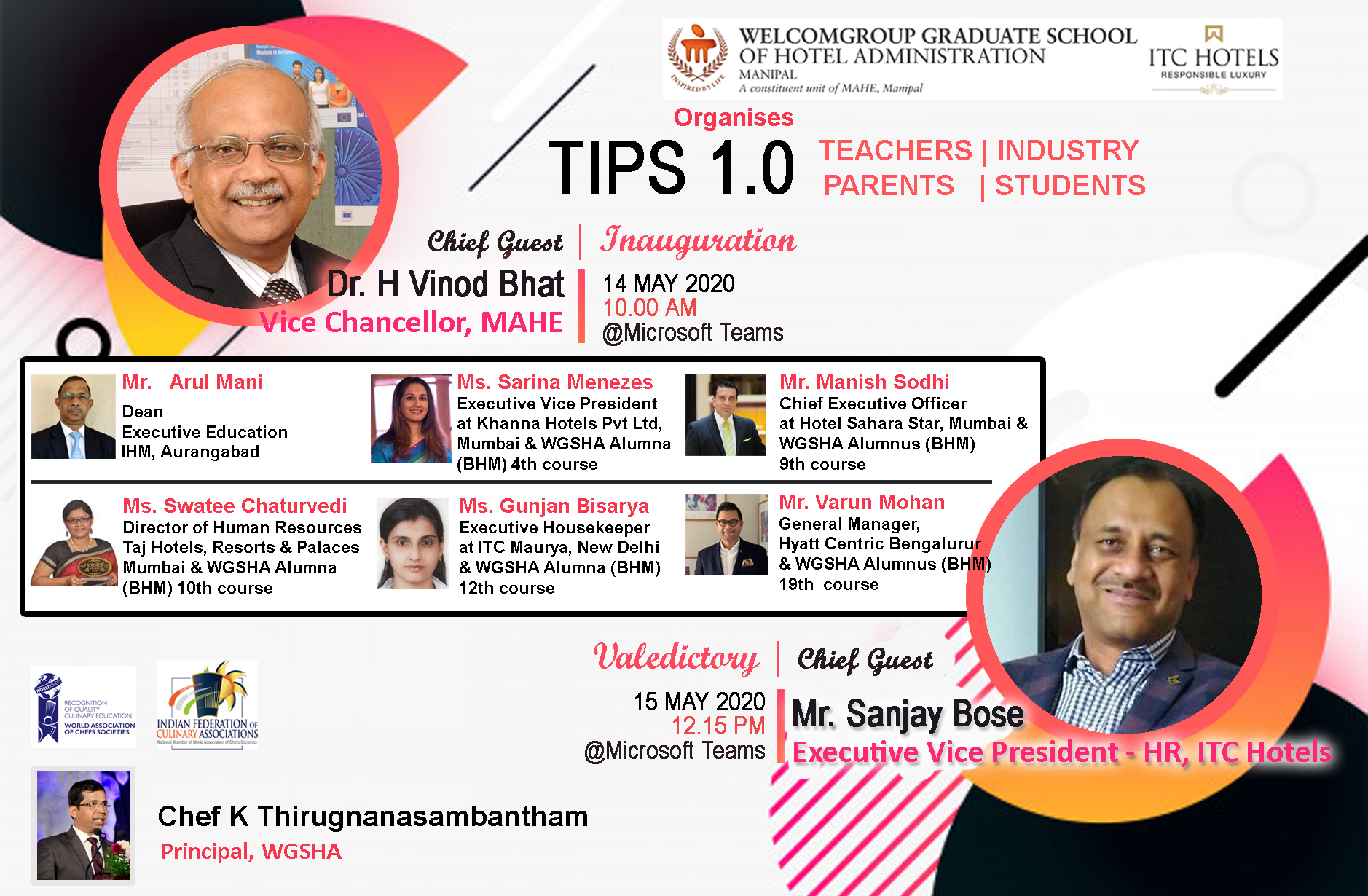 A unique program titled “TIPS” (Teachers, Industry, Parents, Students) was launched at Welcomgroup Graduate School of Hotel Administration on 14th May 2020. The program was inaugurated by the Vice Chancellor of Manipal Academy of Higher Education, Dr. H. Vinod Bhat.