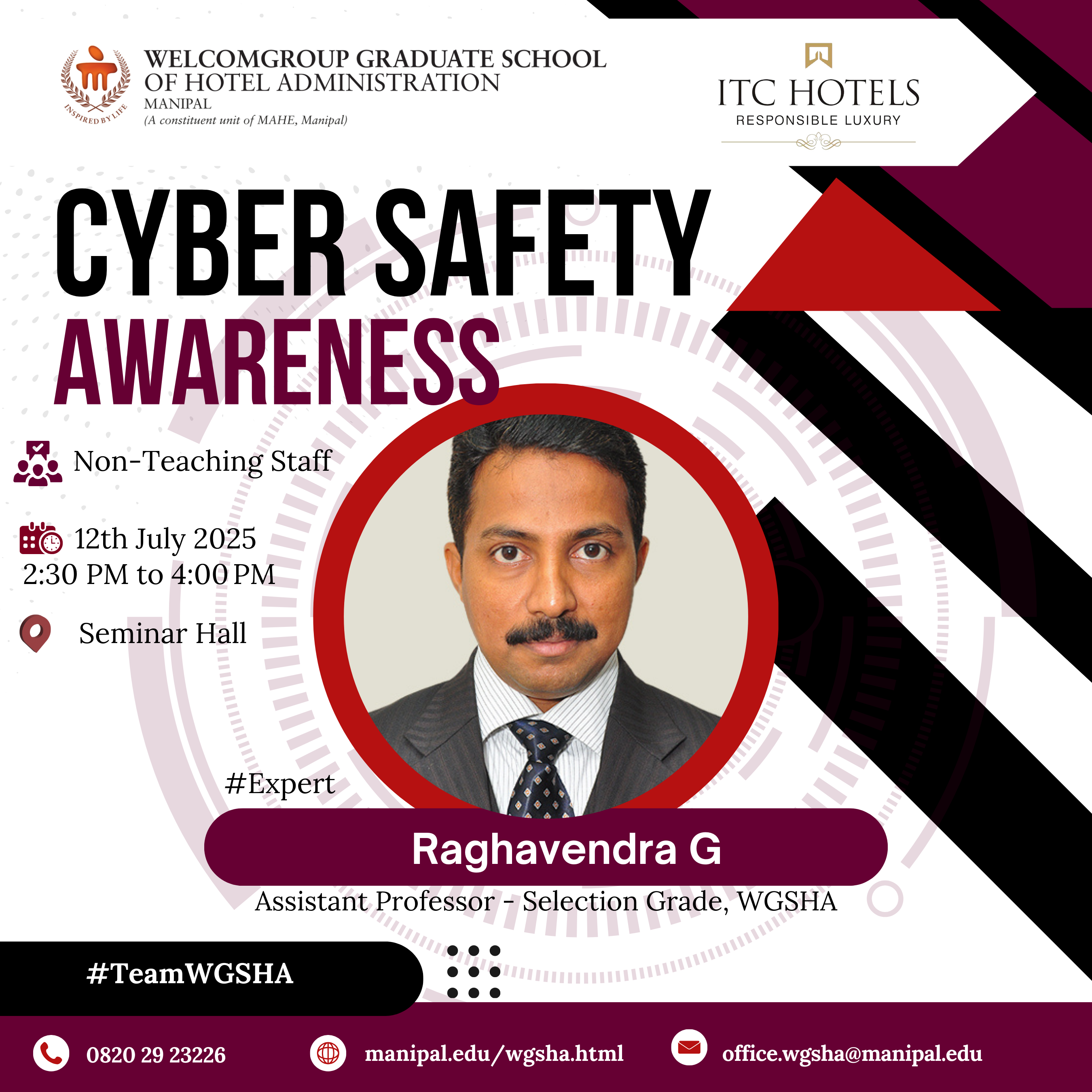 July 12, 2025: WGSHA organizes a Cyber Safety Awareness Program for its non-teaching staff. on Saturday, 12th July 2025, at the Seminar hall between 2.30 PM and 4 PM. Raghavendra G, faculty at WGSHA, will be taking the session.