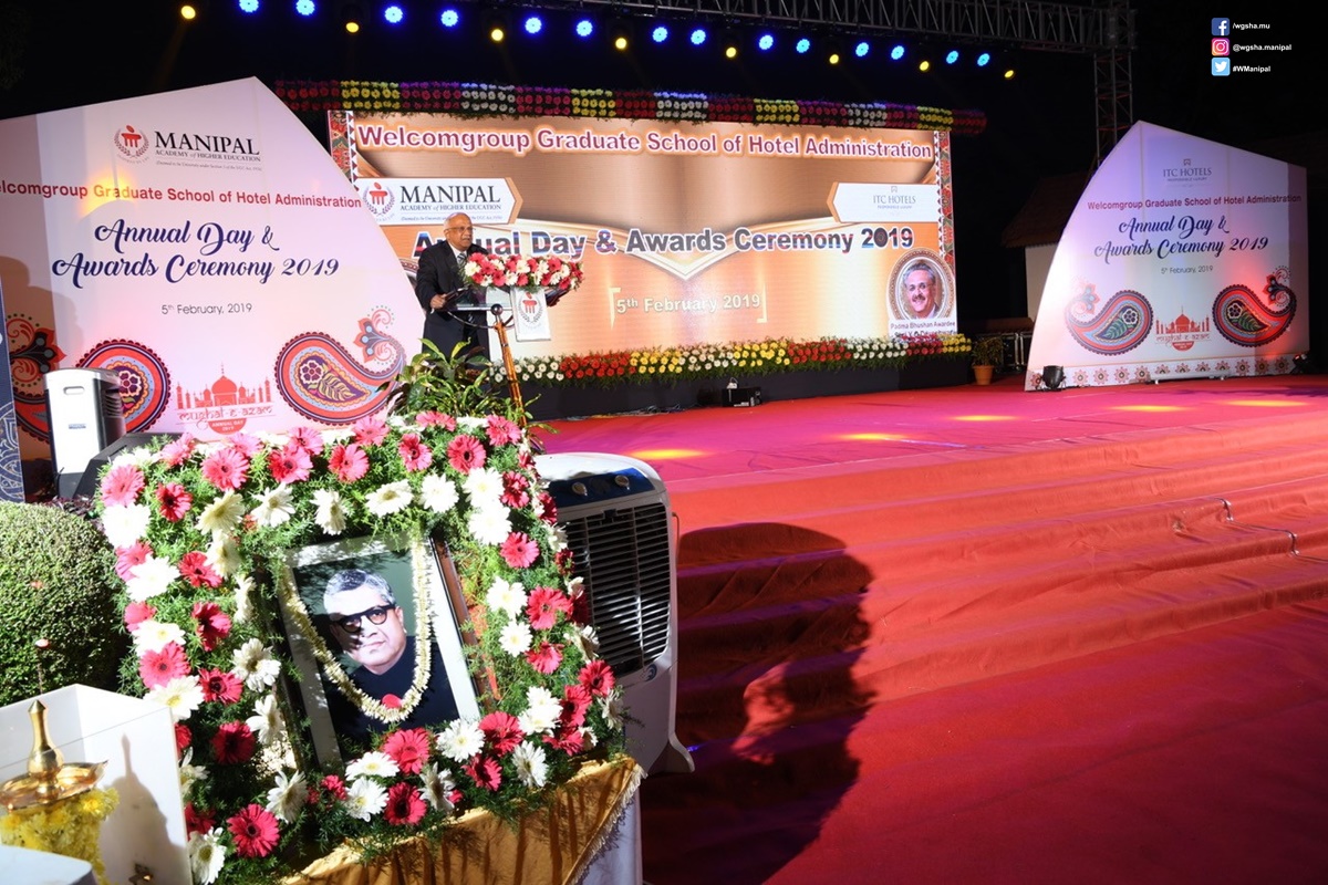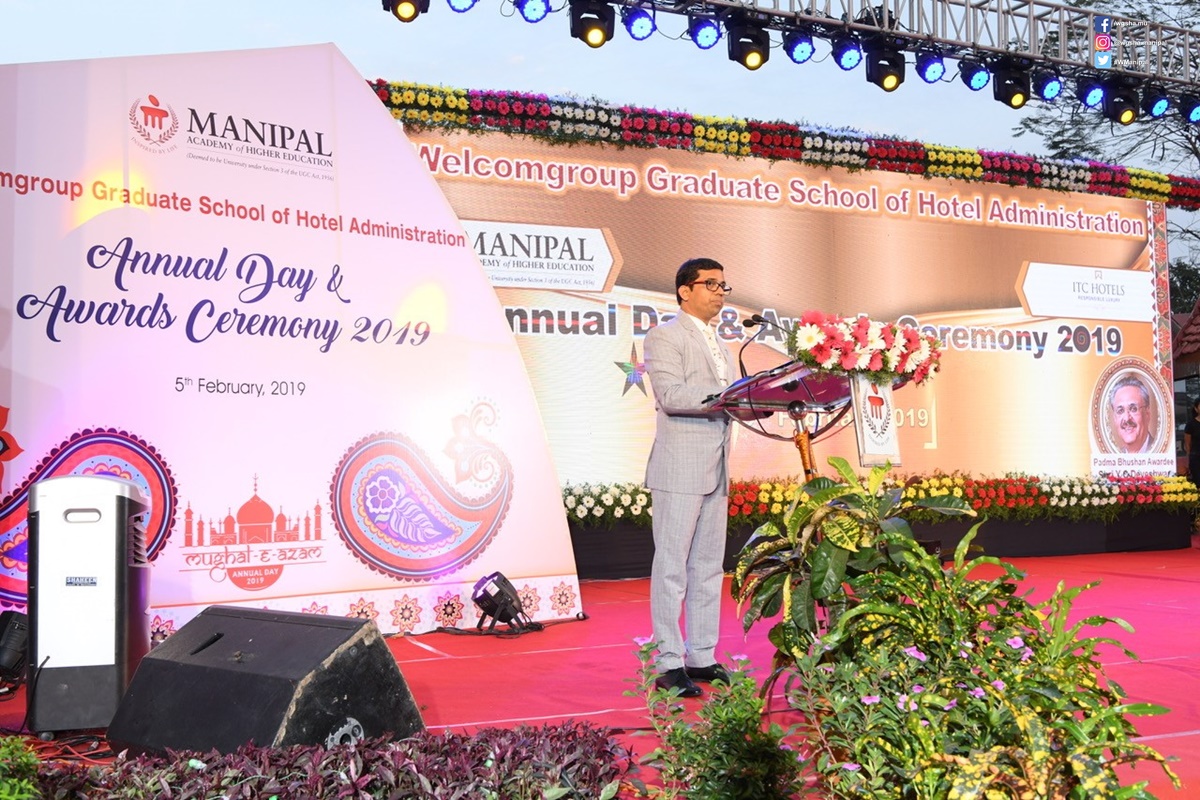 Manipal, February 6: Welcomgroup Graduate School of Hotel Administration (WGSHA), a constituent unit of Manipal Academy of Higher Education, Manipal, celebrated the college’s Annual Day & Awards Ceremony on Tuesday, February 5, 2019 at the lawns of Fortune Inn Valley View, Manipal in presence of Chief Guest, Mr Sanjay Bose, Executive Vice President, Human Resources & Learning & Development, ITC Hotels, ITC Limited. Mrs Vasanti R Pai, first lady of Manipal and Trustee – MAHE Trust, Dr H Vinod Bhat, Vice Chancellor, Mrs Poornima Baliga, Pro Vice Chancellor-Faculty of Health Sciences, Dr P. L. N. G. Rao, Pro Vice Chancellor-Quality Assurance), Mr. Rajen Padukone, Group President, Manipal Education & Medical Group, Dr Narayana Sabhahit, Registrar and other senior ITC and MAHE Officials were present in the occasion.