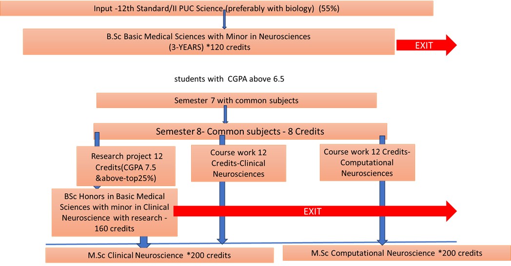 Any student who has completed the first six semesters with a CGPA of 7.5 or above and reaches the top 25% of the class, can progress to the fourth year in which they will pursue a research project in addition to postgraduate level subjects and they can exit with B.Sc. Honors with Research in Basic Medical Sciences (minor in Clinical Neurosciences will be mentioned in transcript) at the end of the fourth year.