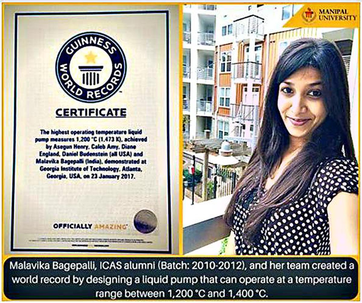 Ms. Malavika Vasishta Bagepalli, an illustrious alumna of the International Centre for Applied Sciences (ICAS), Manipal Academy of Higher Education (B.S. Mechanical Engineering Batch 2010-12), has made a lifetime achievement by entering Guinness World Records through her research outcome!