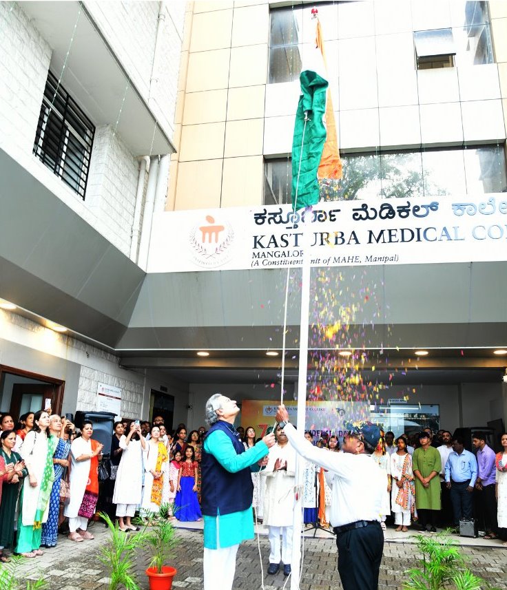Dr. B. Unnikrishnan, Dean of KMC Mangalore, welcomed the gathering. The day’s festivities commenced with the hoisting of the national flag by Dr. Sharath Kumar Rao K., Pro Vice Chancellor, Health Sciences, MAHE, followed by an inspiring message from the Chief Guest.