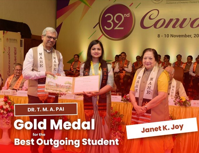 Heartiest congratulations to Ms. Janet K. Joy from the Batch of 2019 for being awarded the prestigious Dr. TMA Pai Gold Medal for the Best Outgoing Student at the 32nd Convocation of MAHE Manipal .
