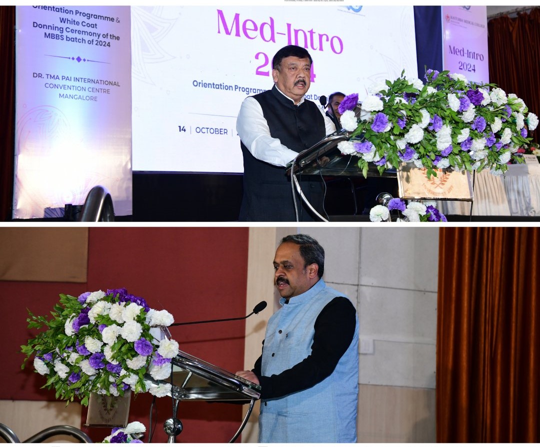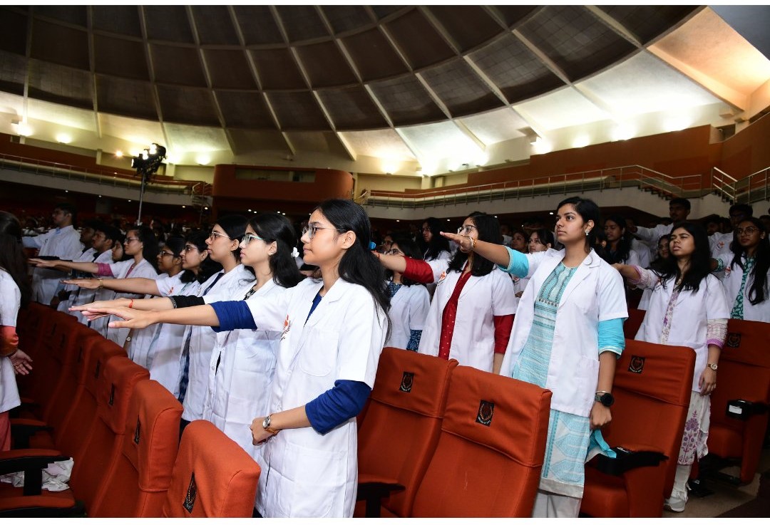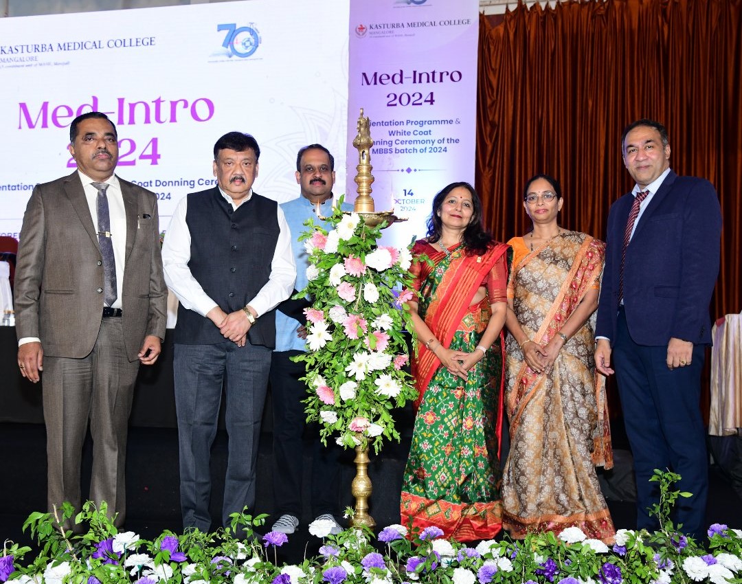 The Med-Intro 2024 for MBBS batch 2024 was held on 14/10/2024. The program included inspiring addresses from Chief Guest Dr. Dilip Naik & Guest of Honor Dr. Kaushik Murali. The highlight was the White Coat Donning Ceremony and the administration of the medical oath.