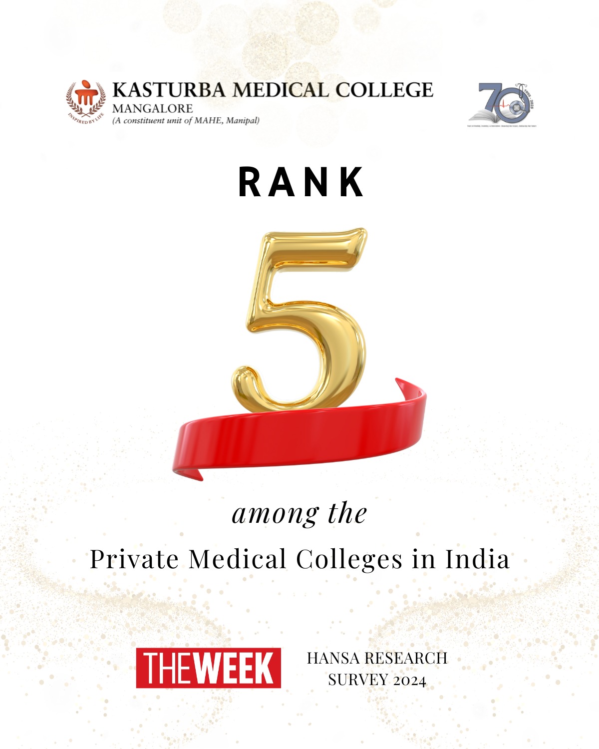 Kasturba Medical College, Mangalore, proudly stands as the 5th-ranked private medical college in India, according to the latest ranking by The Week-Hansa Research Survey 2024.