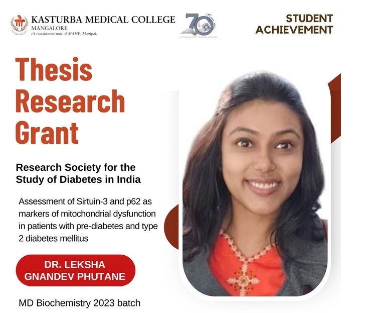 Congratulations to Dr. Leksha Gnandev Phutane, MD Biochemistry, 2023 batch, KMC Mangalore, for securing the MD/MS PG Research Grant from the Research Society for the Study of Diabetes in India
