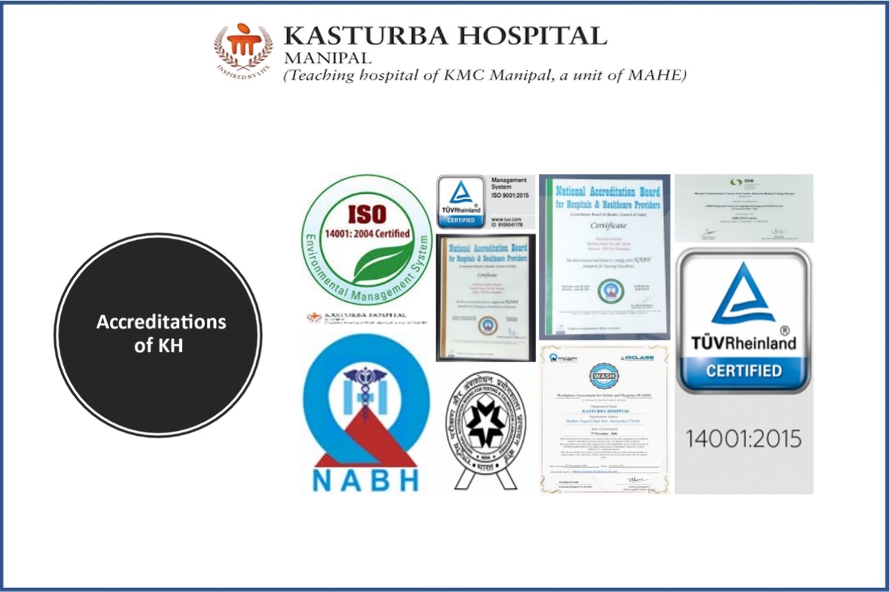 Kasturba Medical College, Manipal and its constituent teaching hospital are both ISO 9001: 2008 certified and ISO 14000: 2004 certified for QMS/EMS displaying a strong commitment to improving the quality of services.