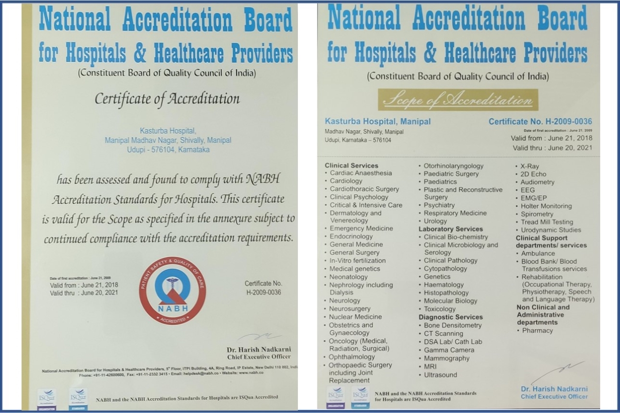 NABH (National Accreditation Board for Hospitals & Healthcare Providers) is a constituent board of Quality Council of India, set up to establish and operate accreditation programme for healthcare organizations. Formed in 2005, it is the principal accreditation for hospitals in India. Kasturba Hospital, a teaching hospital of KMC Manipal has consistently maintained its accreditation status since 2007 for its excellence in healthcare quality and strong commitment to improving the quality of services.