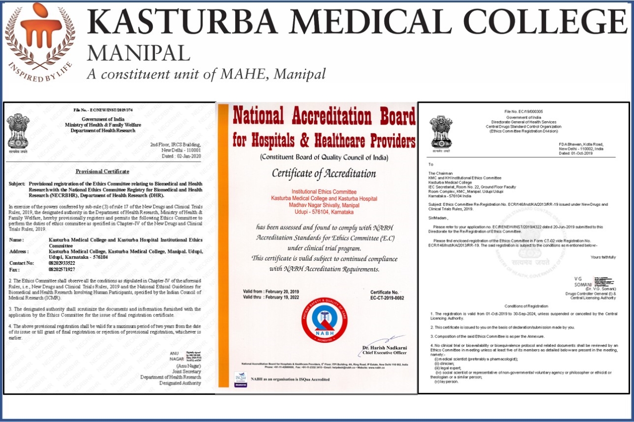 Institutional Ethics Committee of Kasturba Medical College and Kasturba Hospital is NABH accredited for promoting and upholding universal ethical values and international scientific standards.