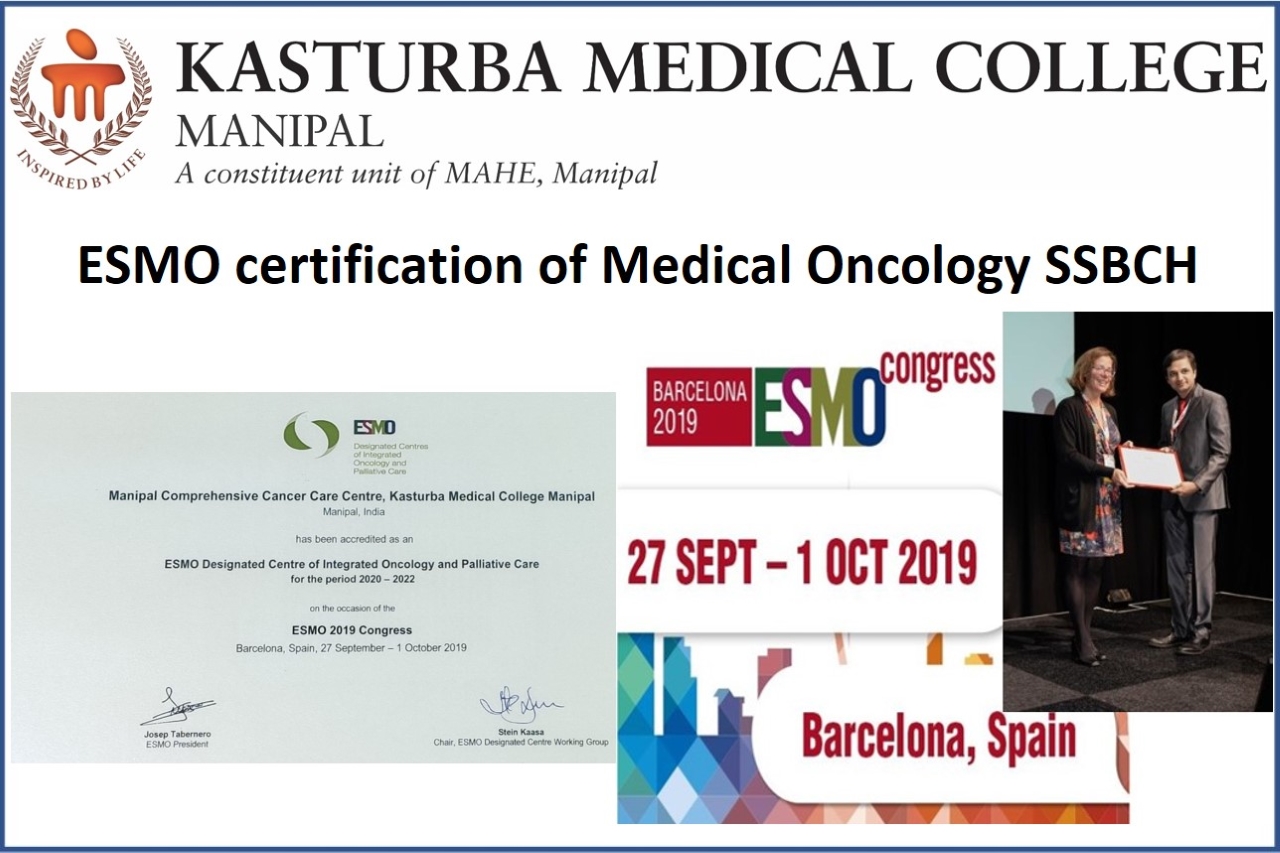 The European Society of Medical Oncology (ESMO) accredits Manipal Comprehensive Cancer Care Centre (MCCCC), KMC, Manipal as the ESMO Centre for Integrated Oncology and Palliative Care. Manipal is just one among the two centres from India qualifying for this award presented at Barcelona, Spain. Dr Karthik Udupa from Medical Oncology accepted the honour on behalf of MCCCC & KMC, Manipal.