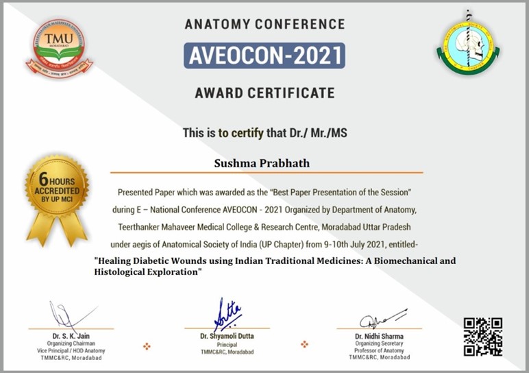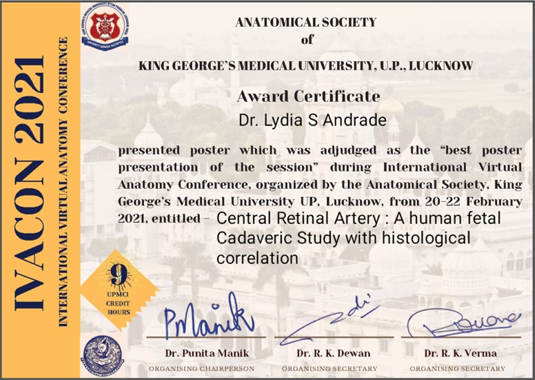 18) Dr. Lydia Andrade (Anatomy) for the best poster award at IVACON (International Virtual Anatomy Conference) 2021, On 20-22 February.