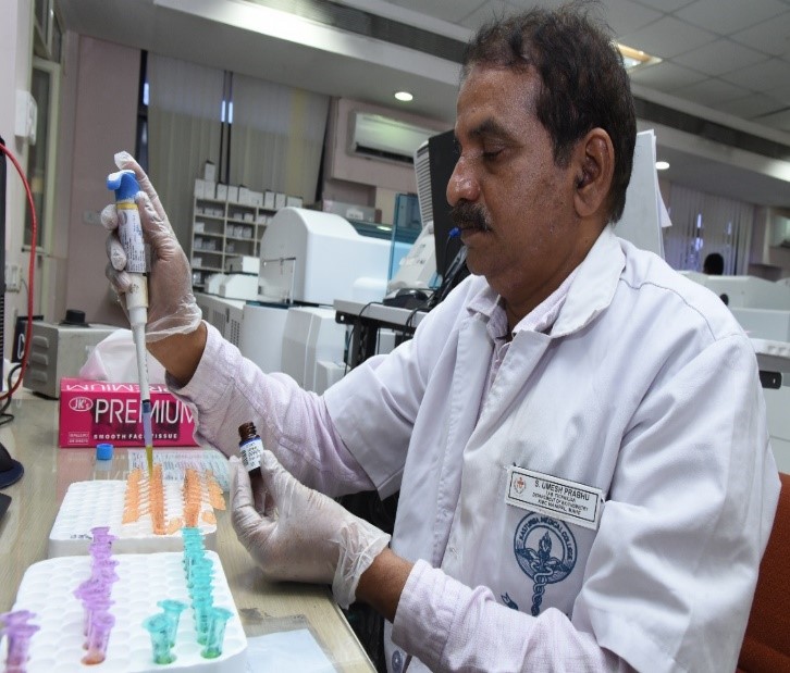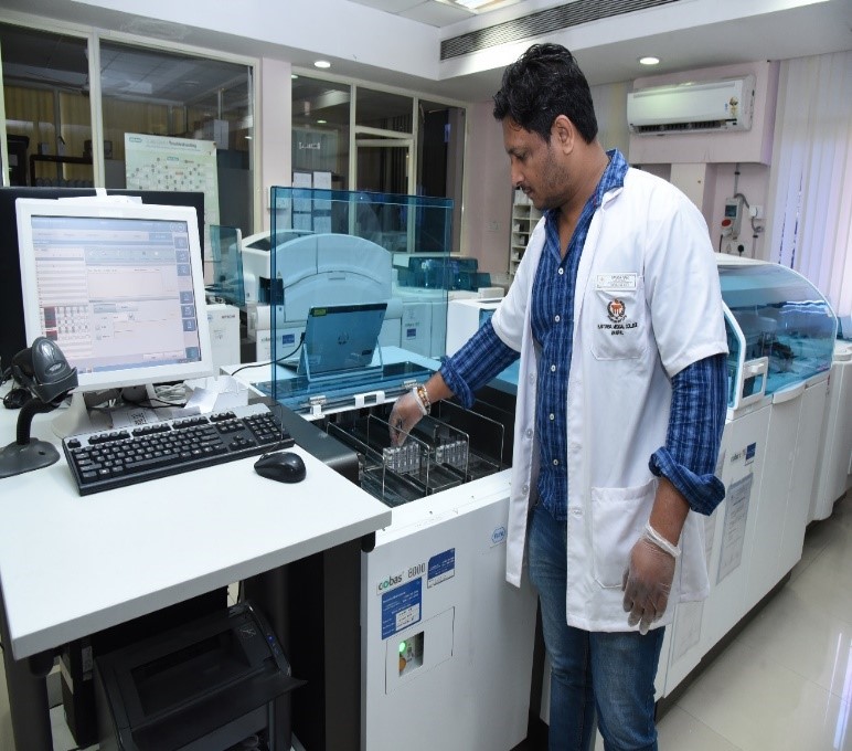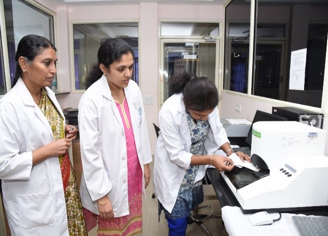 The biochemistry department has a 24 X 7 fully air-conditioned diagnostic lab with high-end auto analyzers, which generates 10,000 lab reports per day for all the outpatients and inpatients visiting our hospital. A total of 27 lab technicians are working in 3 shifts to provide these services. In addition to routine chemistry tests, specialized tests include therapeutic drug monitoring, hormones, and a first-trimester screening panel. The Turn Around Time (TAT) for the tests is a maximum of 6 hours in working hours and non-working hours is 8 hours. The department has facilities to do all tests required for emergency management and routine care of patients within its premises. None of the emergency tests are outsourced.