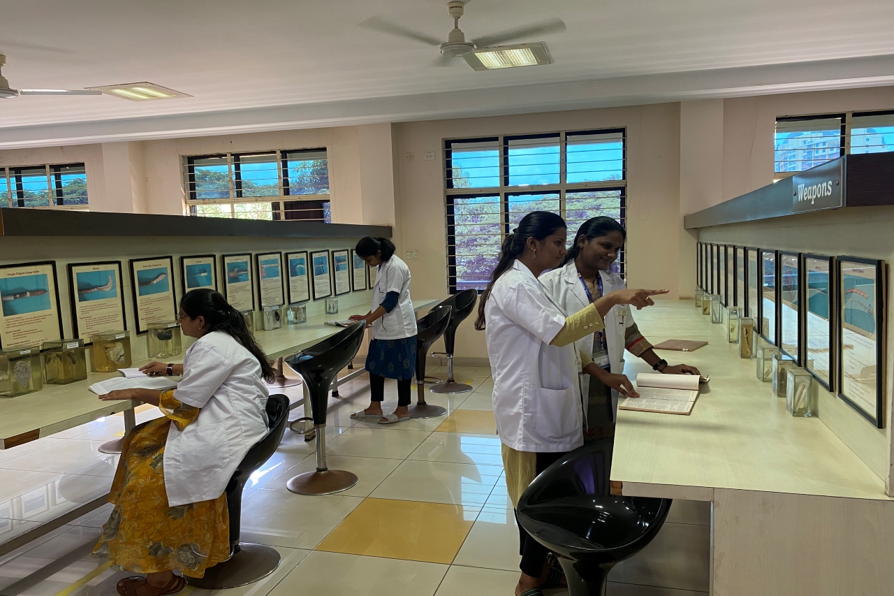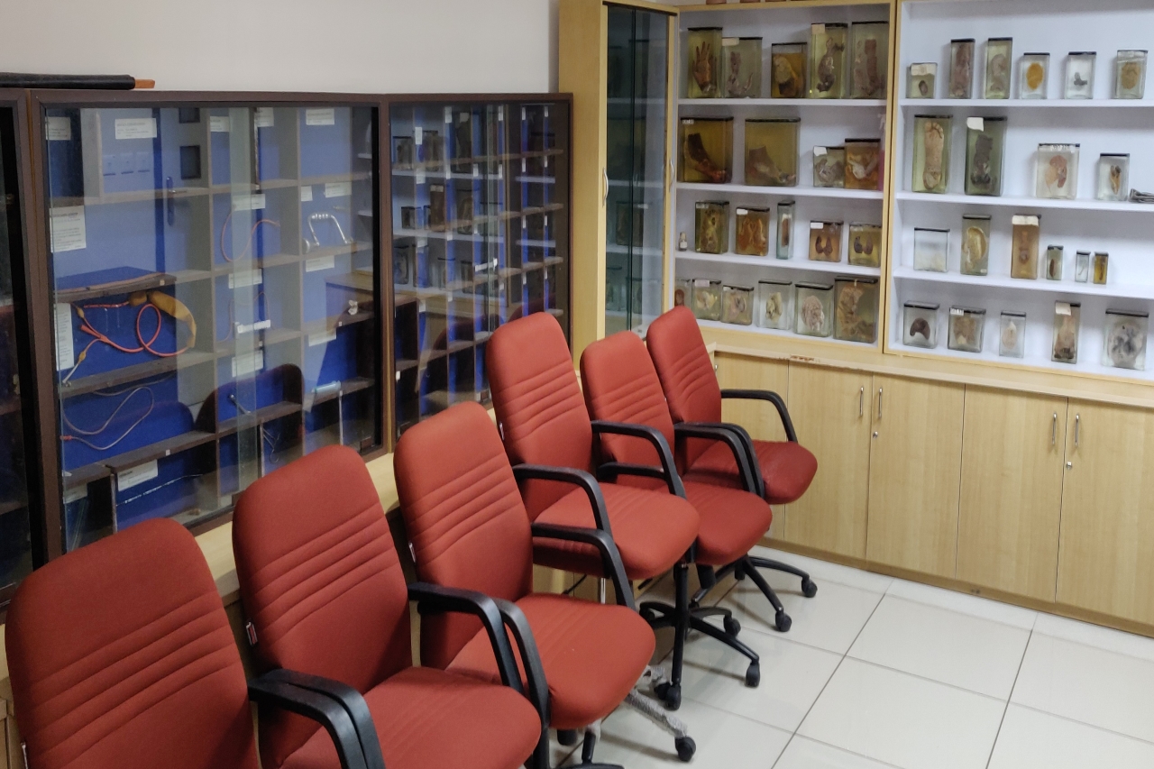 Department museum is set up over an area of 225 sqm2 which contains mounted specimens in glass jars depicting various conditions of forensic importance. It also contains flow charts, photographs, and wax models of various aspects of forensic medicine. Prototypes of firearms and toxicological specimens are also part of the department museum. Important cases which were milestones in the history of Forensic medicine is also depicted with photographs and description. All the specimens are arranged in serial rows with supporting catalogs which give details of the specimen. There are arrangements to seat 80 students at a time.