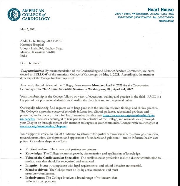 11) Dr. Abdul Razak (Cardiology) received degree - FELLOW of the American College of Cardiology (FACC) on 01 May 2021.
