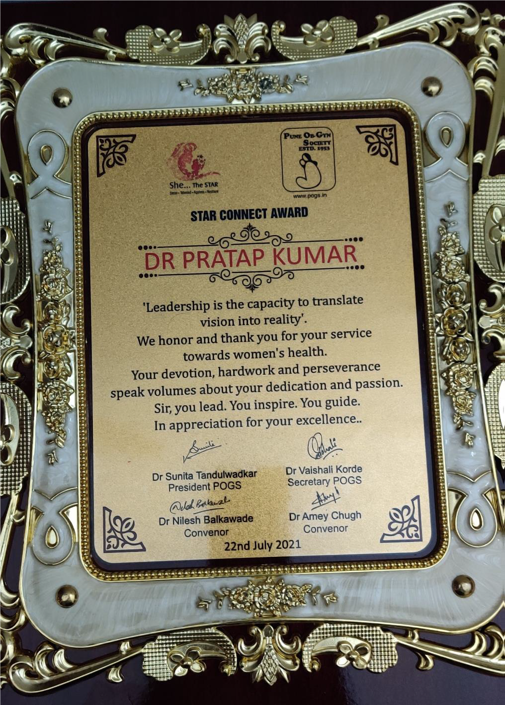 15) Dr Pratap Kumar (Reproductive Medicine & Surgery), received Star Connect Award on 22 July, 2021.