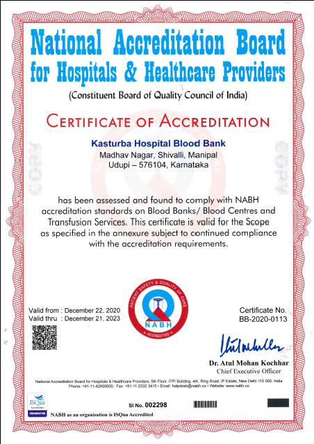 1) Department of Immunohematology and Blood Transfusion received NABH certification
