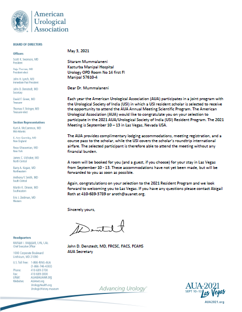 20) Dr Ravi Taori, Dr M. Sitaram, Dr Suraj J & Dr Sourab Reddy (urology) - award winners of prestigious International travelling fellowships offered by Urological Society of India, in all India Online Examination to visit AUA (American Urology Association) and European (EUREP) centers of Excellence and stay for two weeks as observer fully sponsored by AUA and EAU including International travel.