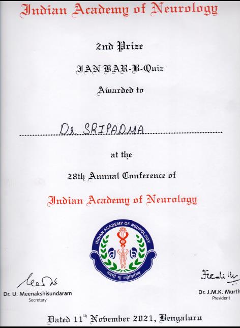 33) Dr. Sripadma P. V. (Neurology) Awarded 2nd prize IAN BAR-B-Quiz, 28th Annual Conference of Indian Academy of Neurology (IANCON 2021), 11-Nov-20 21 (International)