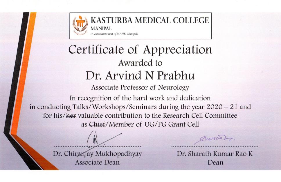 37) Dr. Arvind N Prabhu (Neurology) Certificate of Appreciation from Dean, Kasturba Medical College, MAHE, Manipal. In recognition of the hard work and dedication in conducting Talks, Workshops, Seminars and valuable contribution to the Research Cell Committee.