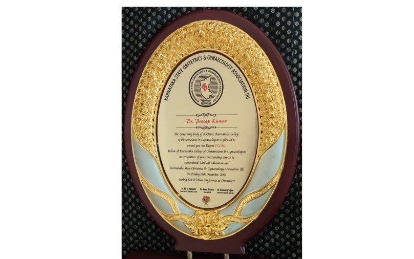 41) Dr Pratap Kumar (Reproductive Medicine & Surgery) received “Fellow of Karnataka College of Obstetricians & Gynaecologists (FKCOG) degree”Outstanding service to women hood & Medical Education for more than three decades by Karnataka State Obstetrics & Gynaecology Association (KSOGA), 31st KSOGA conference at Davangere; 17-Dec-21. (National)