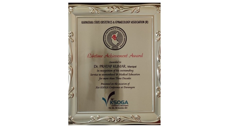 40) Dr Pratap Kumar (Reproductive Medicine & Surgery) received “Lifetime Achievement Award” for the year 2021. Outstanding service to women hood & Medical Education for more than three decades by Karnataka State Obstetrics & Gynaecology Association (KSOGA), 31st KSOGA conference at Davangere; 17-Dec-21. (National)