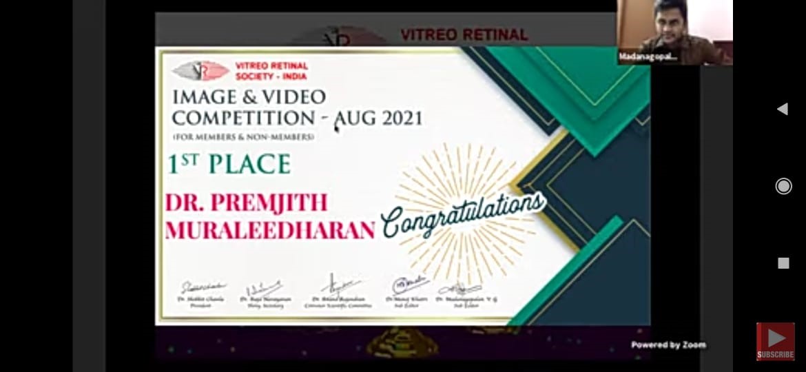 32) Dr. Premjith Muraleedharan (MS Ophthalmology) 1st Place in Image & Video Competition, Vitreo Retinal Society, India, Aug 2021