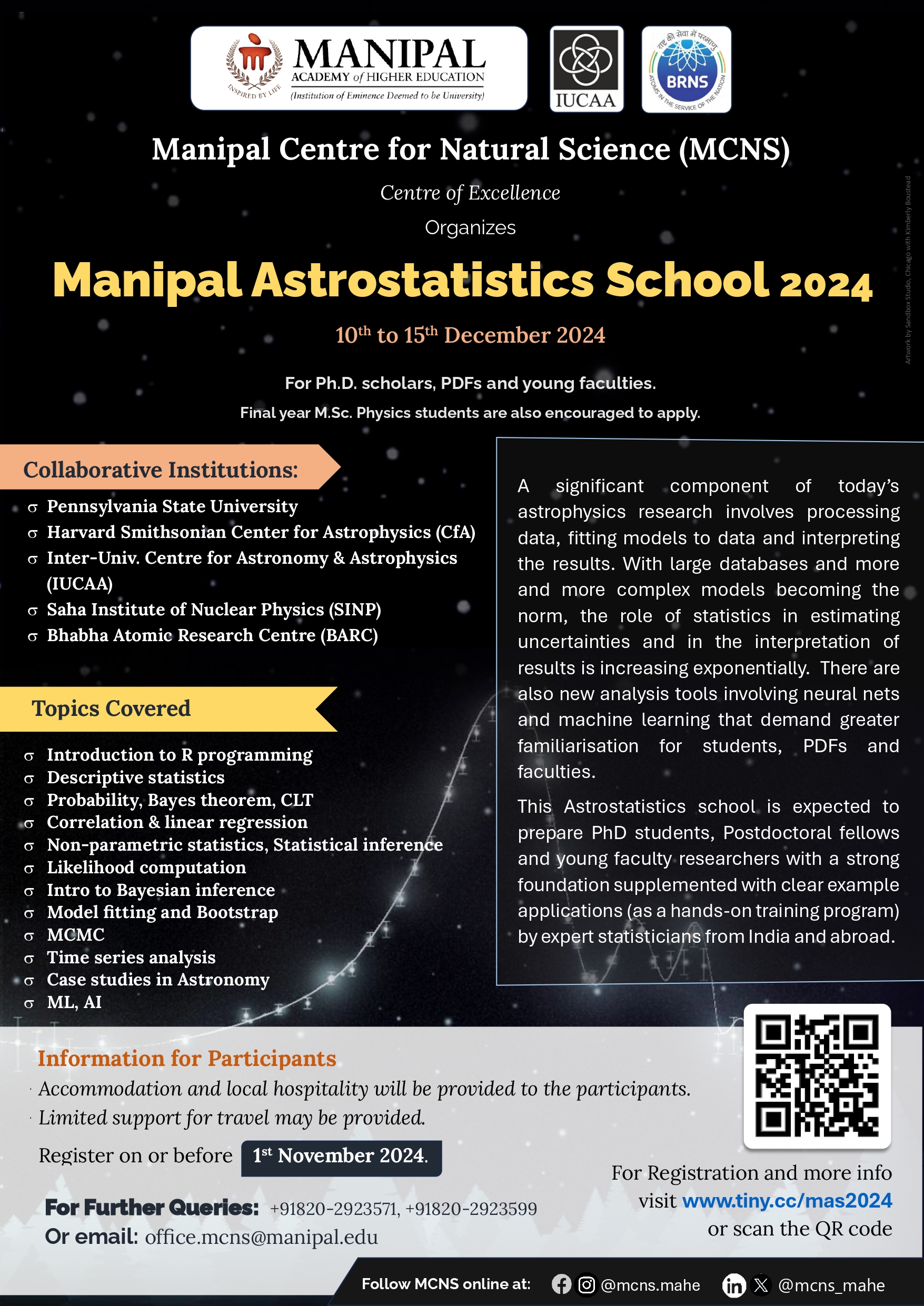 The proposed school on Astrostatistics is planned to serve Ph.D students. Post-doctoral fellows and young faculty researchers. It is expected to prepare them with a strong foundation supplemented with clear example applications (as a hands-on training program) by expert statisticians from India and abroad.