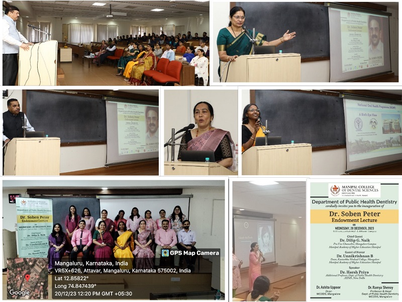 An endowment lecture honouring the legacy of Professor Late Dr Soben Peter on his birthday was organized by the Department of Public Health Dentistry, Manipal College of Dental Sciences, Mangalore on 20th December 2023. A total of 78 participants attended the program, which included post graduate and undergraduate students, and faculty members from MCODS, Mangalore and other dental colleges of India. (International-0, National-78, From MAHE-71, Outside MAHE-7)