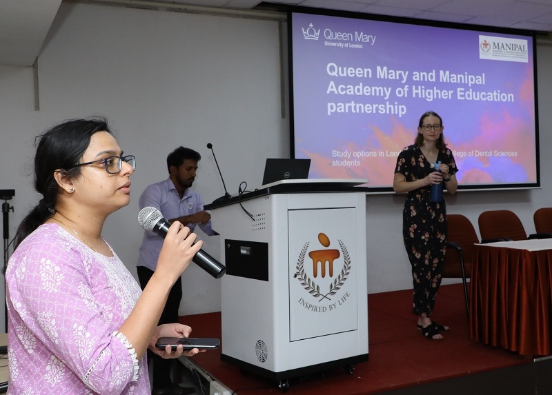 Institutional Academic Reputation Cell, MCODS, Mangalore with the support of Office of International Affairs and Collaboration organised a Career guidance program titled “Higher Education at Queen Mary University, London”. This program was held at Medical education hall LHH. Ms Claire Canning, International Partnership Manager, Queen Mary University introduced the students to the university, the dental college as well as the dental program offered and spoke about the details of the partnership with Manipal Academy of higher education. The program was attended by 63 interns.