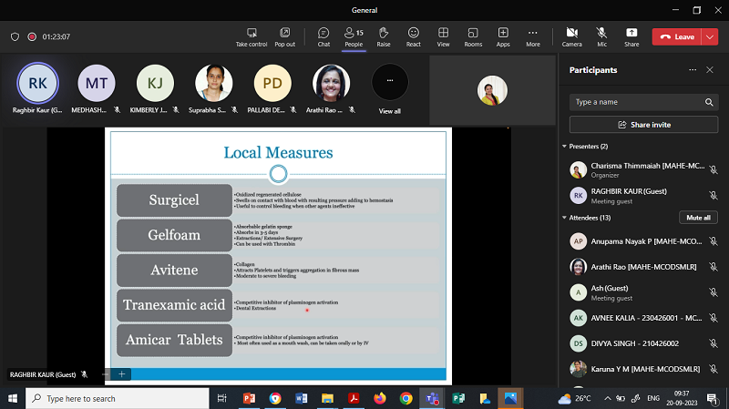 The Department of Pediatric and Preventive Dentistry, Manipal College of Dental Sciences, Mangalore conducted an online lecture session by adjunct faculty, Dr. Raghbir Kaur, Director, Pediatric Dental Services and Associate Director, Pediatric Dental Residency Program at NYU Langone Health, USA, for faculty and post graduate students of the department of Pediatric and Preventive Dentistry. The topic was “Clinical Guidelines for the Management of Bleeding Disorders in Pediatric Dentistry”.This was followed by an interactive question answer session.