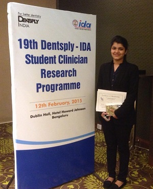 Ms. Shivani Daga, final year Part II Student bagged the second runner up prize in “19th Dentsply –IDA Student Clinician Research Programme” under Table Clinic competition in Bangalore on Feb 13, 2015. She presented study titled “Antimicrobial efficacy of toothpastes containing neem leaf and pomegranate peel extract on oral microorganisms: An in-vitro study”. The project was done under the guidance of Dr. Ramya Shenoy, Associate Professor, department of Public Health Dentistry.