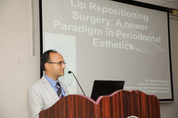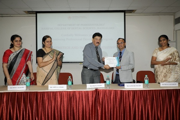 The department of Periodontology MCODS Mangalore conducted a Continuing Dental Education Program titled “Perioesthetics and Implant Dentistry” on 12th April 2019. Dr Manoj Humagain, who is an alumnus of MODS Mangalore was the resource person for the same. He is currently serving as the Associate Professor and Head of the Department of Periodontology and Oral Implantology, Kathmandu University School of Medical Sciences, Kathmandu, Nepal. He spoke on Lip repositioning and “Socket shielding techniques. The inaugural function was presided over by Dr Dilip G Naik, Dean MCODS Mangalore, Dr Ashita Uppoor and Dr Premalatha K Associate Deans MCODS, Mangalore. It was attended by around 70 Interns and Postgraduate students of our Institute and from neighbouring Institutes from Mangalore. The talks were well received by all.